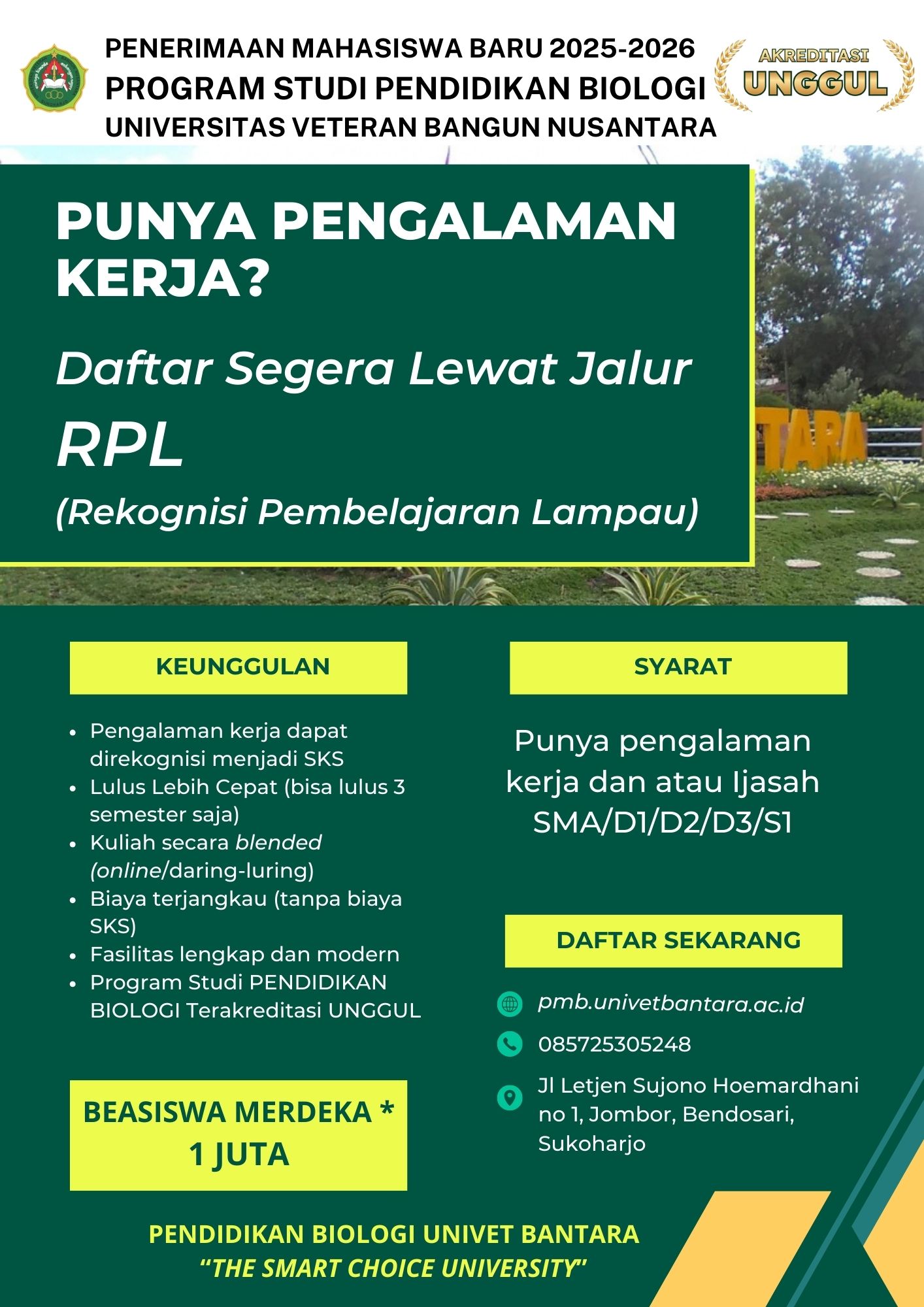 Kami dari Program Studi Pendidikan Biologi Universitas Veteran Bangun Nusantara (Univet Bantara) Sukoharjo siap menyambut putra-putri terbaik untuk melanjutkan studi kuliah dan bersama-sama belajar, berkarya, serta menginspirasi melalui dunia pendidikan biologi.